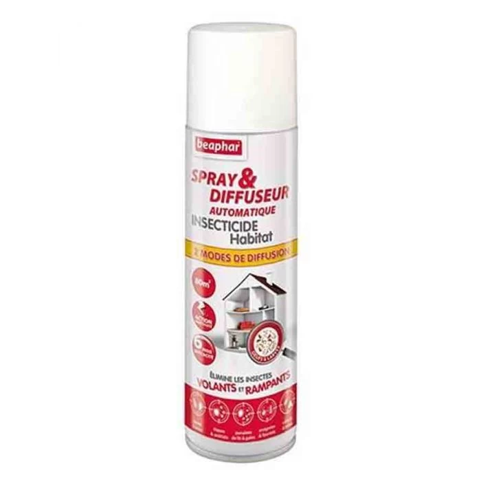 Lo Spray & Diffusore automatico insetticida per la casa di Beaphar protegge le case e l’ambiente degli animali eliminando i parassiti adulti, le uova e le loro larve. Questo diffusore ha una doppia azione insetticida e acaricida contro i parassiti volanti e rampanti.