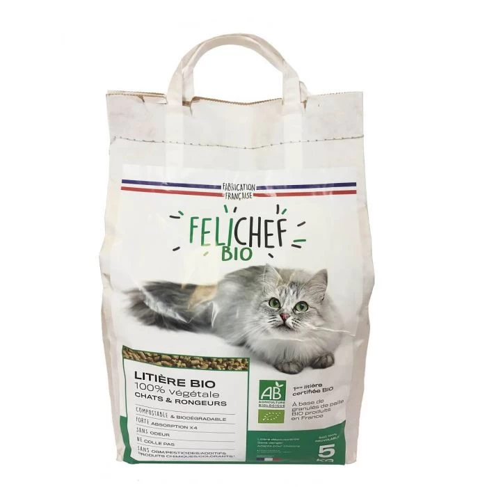 La lettiera Felichef litière vegetale Bio è adatta a gatti e roditori. Questa lettiera è composta da granuli di paglia di grano BIO, raccolti e lavorati in Francia. È una lettiera antipolvere con un elevato potere assorbente.